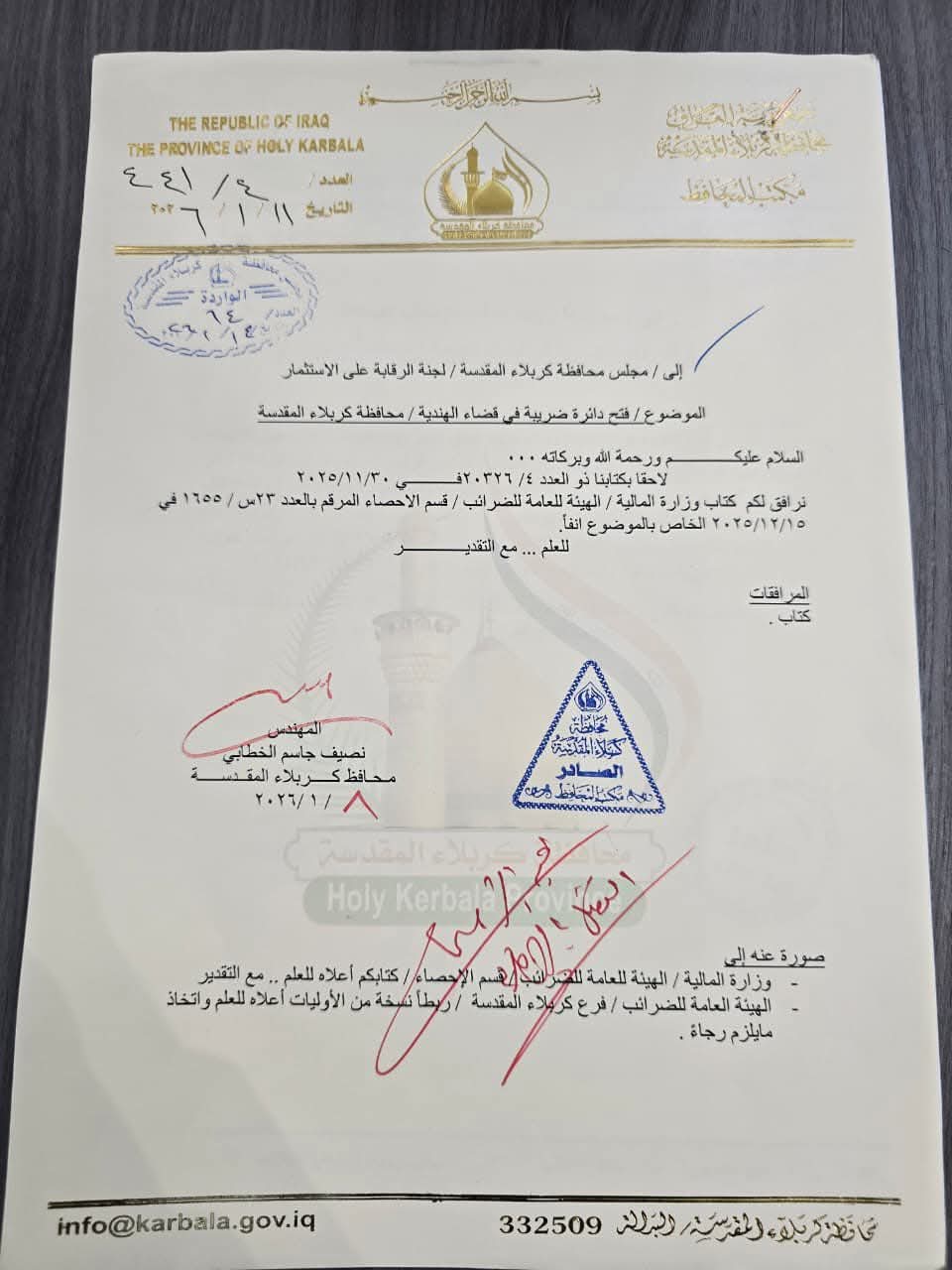 وجاء القرار تنفيذًا لكتاب وزارة المالية/ الهيئة العامة للضرائب – قسم الإحصاء، وبالإشارة إلى مخاطبات مجلس محافظة كربلاء المقدسة/ لجنة الرقابة على الاستثمار، وبما ينسجم مع متطلبات التوسع في تقديم الخدمات المالية وتنظيم العمل الضريبي داخل القضاء.