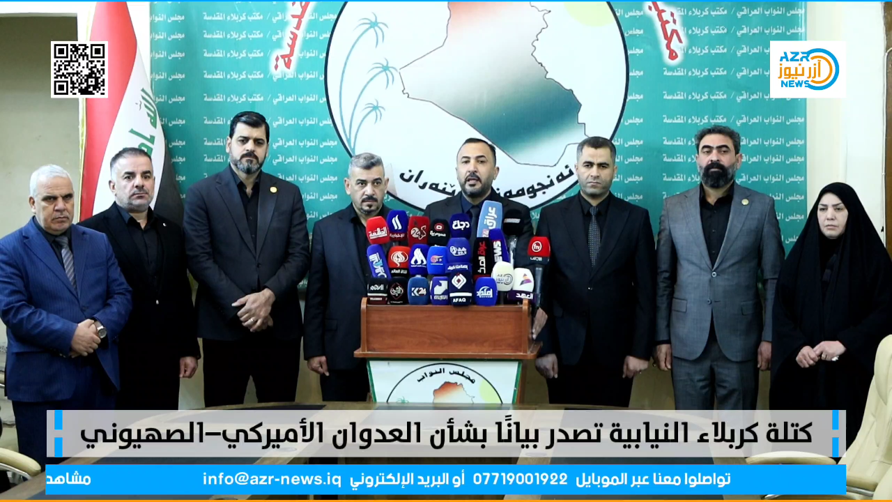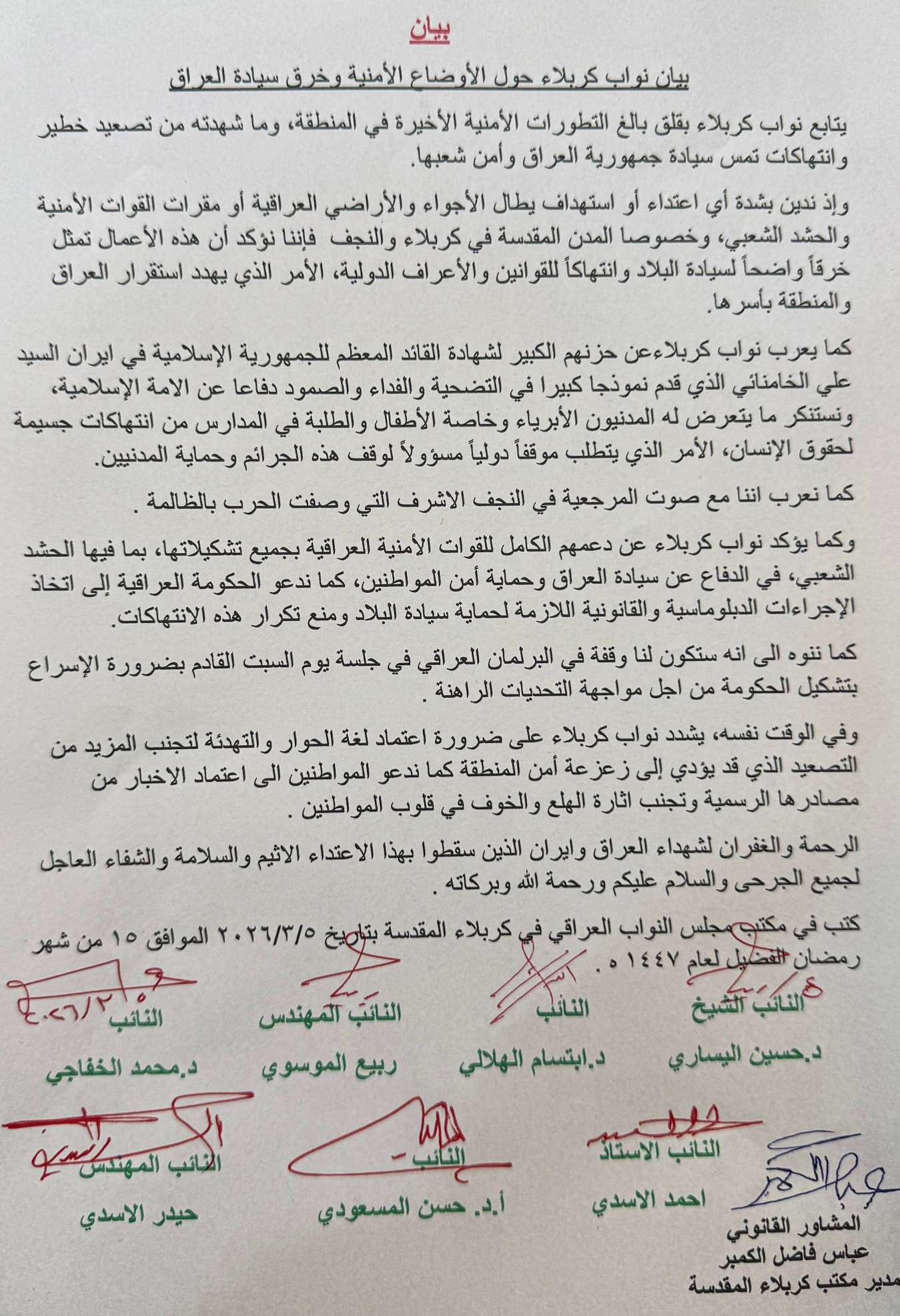 جاء ذلك في بيان صدر عن مكتب مجلس النواب العراقي في كربلاء المقدسة بتاريخ 5 آذار 2026، الموافق 15 رمضان 1447 هـ، تضمن إدانة صريحة لأي اعتداء أو استهداف يطال الأجواء أو الأراضي العراقية أو مقرات القوات الأمنية والحشد الشعبي، ولا سيما في المدن المقدسة كربلاء والنجف، معتبرين أن استمرار هذه التطورات يهدد استقرار العراق والمنطقة بأكملها.